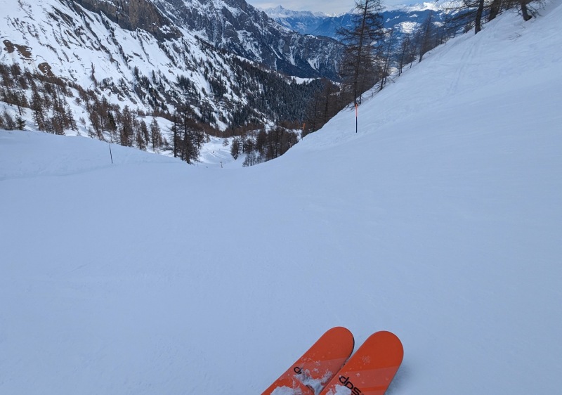 Off-piste tree-ski terrain is steep, open larch woodland graduating into heavy pine forest down low. The larches represent a potentially fun powder day experience but were heavily tracked when I visited. Overall terrain aspect is from north, through east and partly south, avoiding the worst of the afternoon sun.