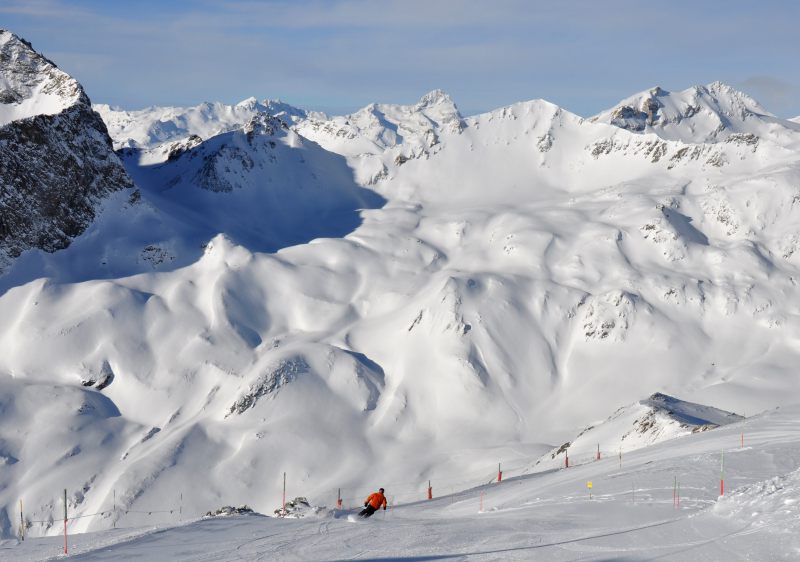 It is possible to ski glaciers at both Diavolezza and Corvatsch ski resorts. At Corvatsch one can ride the glacier for a few hundred metres vertical on or off-piste without too much challenge. At Diavolezza, the glacier skiing is via the 10km off piste valley run to Morteratsch. Whilst not seriously difficult, the glacier has crevasse hazards & can be rocky down low if snow cover is marginal. Check conditions before going.