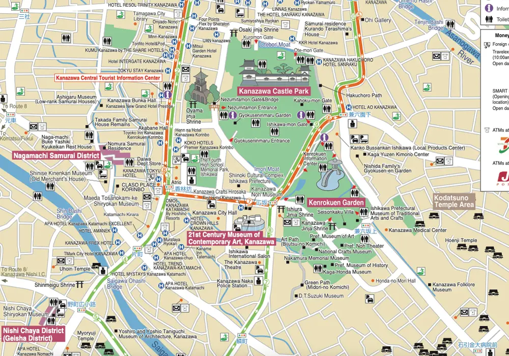 The city of Kanazawa isn’t too large so you can see many attractions on foot from your hotel or explore by bicycle. Or very conveniently, there are a couple of bus loops that head about a main block wide of the Kanazawa Castle park and the Kenroku-en gardens, and run to and from Kanazawa Station, so if you stay reasonably centrally, you’ll be easily able to go sightseeing. The two maps above will give you a feel for the locations of various activities and the bus loops.
